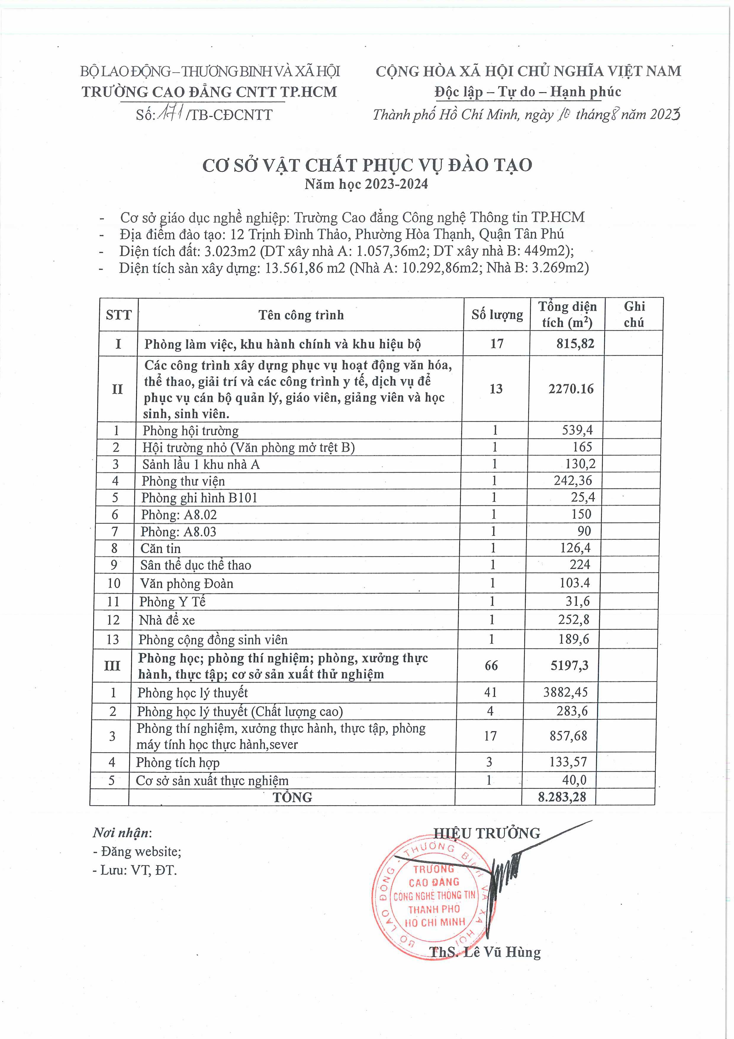 CƠ SỞ VẬT CHẤT PHỤC VỤ ĐÀO TẠO NĂM HỌC 2023 - 2024