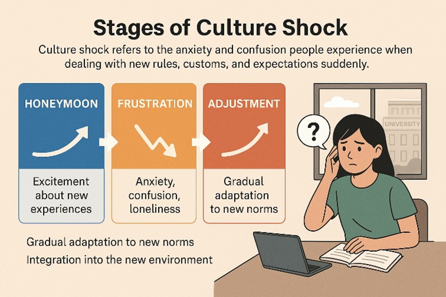 Culture shock refers to the anxiety and confusion that people experience when they are dealing with new rules, customs, and expectations suddenly. Jandt (2021) states that people typically go through four stages, including an initial short phase called “honeymoon”, followed by a challenging period of frustration, and eventually ending with adjustment and adaptation. This is a domestic move for rural students who travel to Ho Chi Minh City for higher study. However, that change is significant as it involves a new urban lifestyle, unfamiliar university environment, new classmates, and various types of communication in the classroom. Students often have feelings of being uncertain during the “frustration” stage. They tend to talk after they observe. They also stay away from public risk. In an English lesson, this can be seen as being quiet during group discussions, or questions asked privately after the lesson finishes (Jandt, 2021).