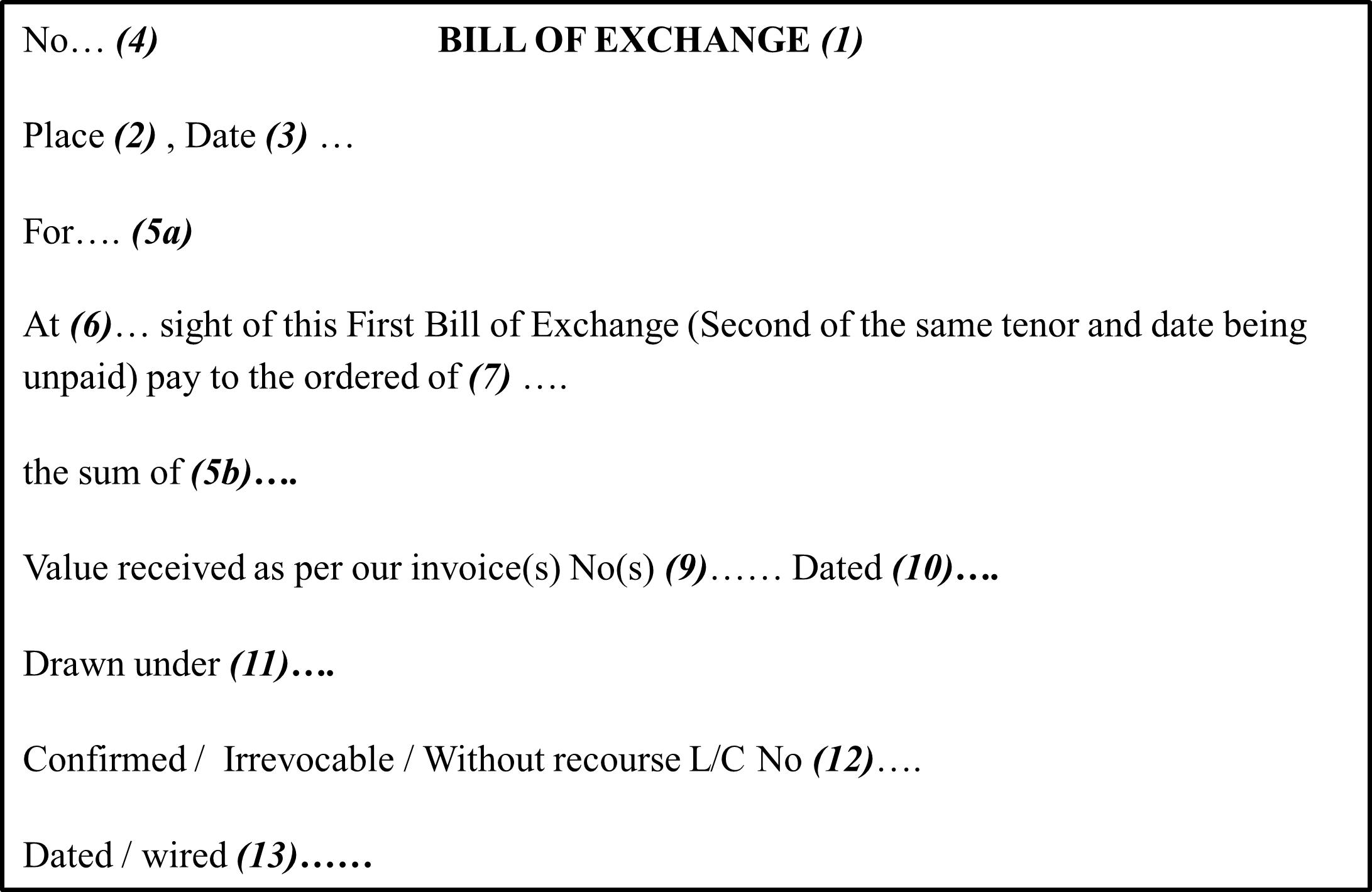 (1) Tiêu đề của hối phiếu. Theo “Luật thống nhất về hối phiếu ULB 1930” và “Luật các công cụ chuyển nhượng của Việt Nam 2005”, một hối phiếu bắt buộc phải có tiêu đề. Tiêu đề của hối phiếu có thể là “Exchange” hoặc “Bill of Exchange”, “Hối phiếu đòi nợ” hoặc “Hối phiếu”. Nếu thiếu tiêu đề, chứng từ đó không được công nhận là Hối phiếu.