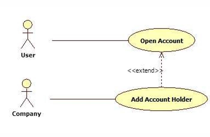 Trong ví dụ trên “Open Account” là Use Case cơ sở để cho khách hàng mở tài khoản. Tuy nhiên, có thêm một điều kiện là nếu khách hàng là công ty thì có thể thêm người sở hữu lên tài khoản này. Add Account Holder là chức năng mở rộng của Use Case “Open Account” cho trường hợp cụ thể nếu Actor là Công ty nên quan hệ của nó là quan hệ Extend.