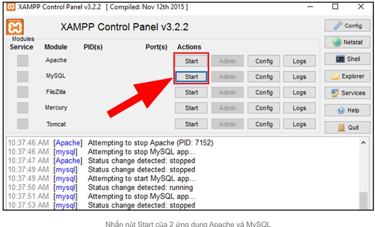 Bước 2: Nhấn vào nút Start của 2 ứng dụng Apache và MySQL để bắt đầu khởi động web server. Khi 2 ứng dụng chuyển sang màu xanh thì localhost đã được khởi động.