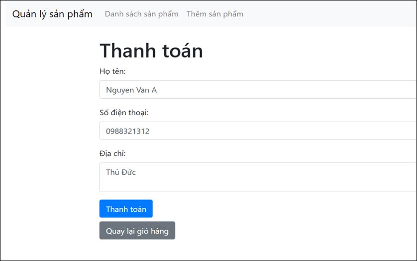 Tại giao diện này, khách hàng có thể xem lại tổng tiền hàng. Để có thể thực hiện thanh toán khách hàng cần điền đầy đủ thông tin vào biểu mẫu gồm các thông tin như họ tên người nhận, số điện thoại người nhận, địa chỉ nhận…