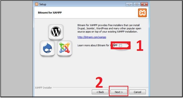Bước 5: Bỏ chọn phần Learn more about Bitnami for XAMPP > Nhấn Next 2 lần nữa để bắt đầu quá trình cài đặt XAMPP.