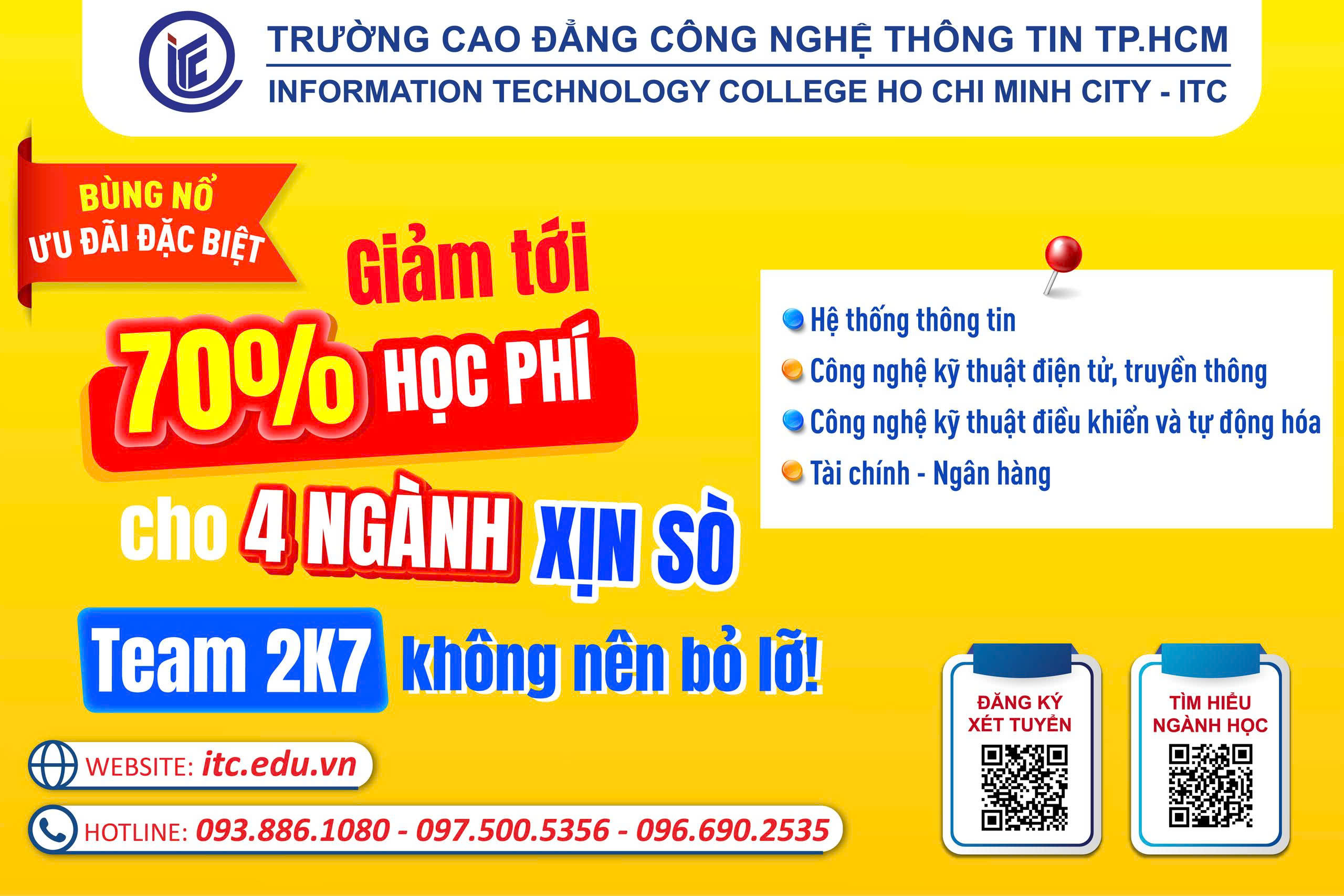 Nếu bạn đang tìm kiếm một chương trình học chất lượng với chi phí hợp lý, thì đây chính là cơ hội không thể bỏ qua. Trường Cao đẳng Công nghệ Thông tin TP.HCM (ITC) đang triển khai chương trình ưu đãi học phí cao đẳng cực hấp dẫn, giúp học sinh lớp 12 – đặc biệt là team 2k7 – dễ dàng tiếp cận nền giáo dục thực tiễn với mức chi phí tiết kiệm tối đa.