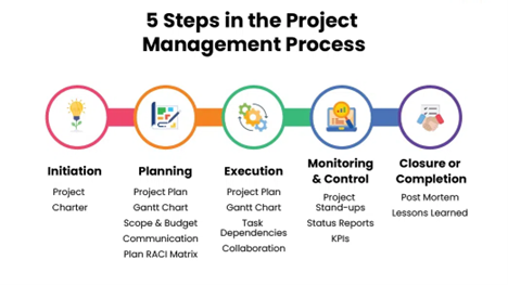 Dưới đây là tóm tắt 5 giai đoạn vòng đời của dự án: