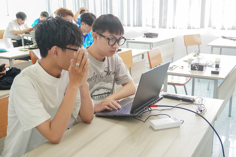 Ngay từ sớm, không khí tại phòng học đã trở nên "nóng" hơn bao giờ hết. Không khó để bắt gặp hình ảnh các nhóm sinh viên tụm năm tụm ba, người tranh thủ kiểm tra lại từng mối nối dây, người tỉ mẩn hiệu chỉnh cảm biến trên thiết bị. Sự hồi hộp hiện rõ trên gương mặt, nhưng bao trùm tất cả là sự tự tin và quyết tâm bảo vệ thành quả sau nhiều tuần miệt mài nghiên cứu.