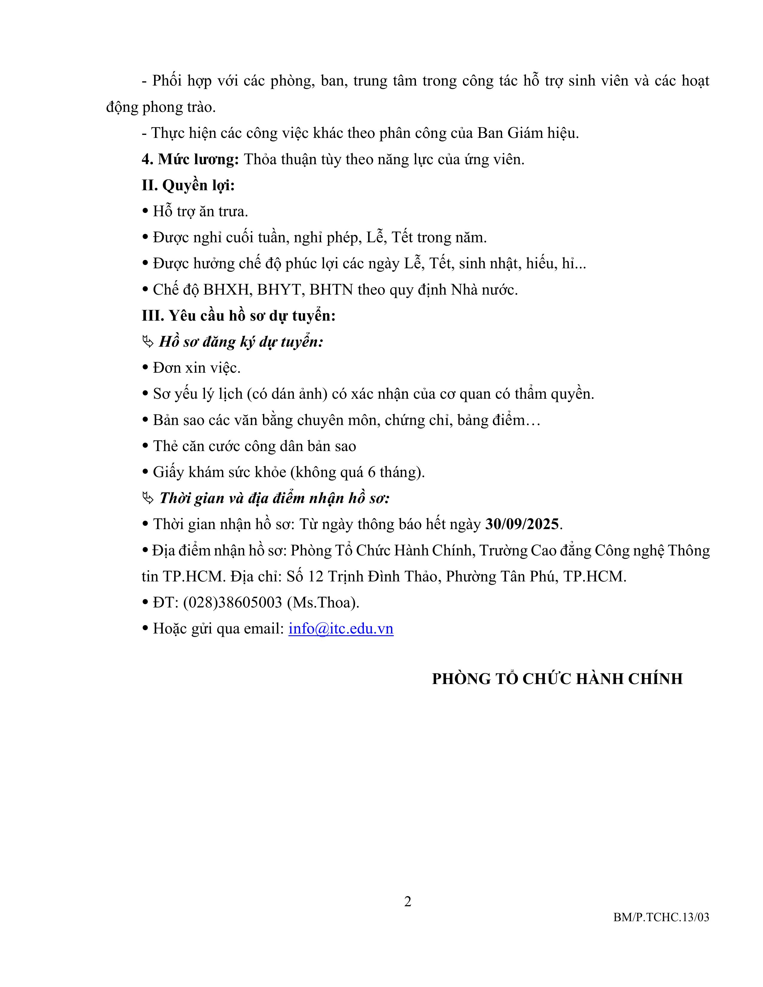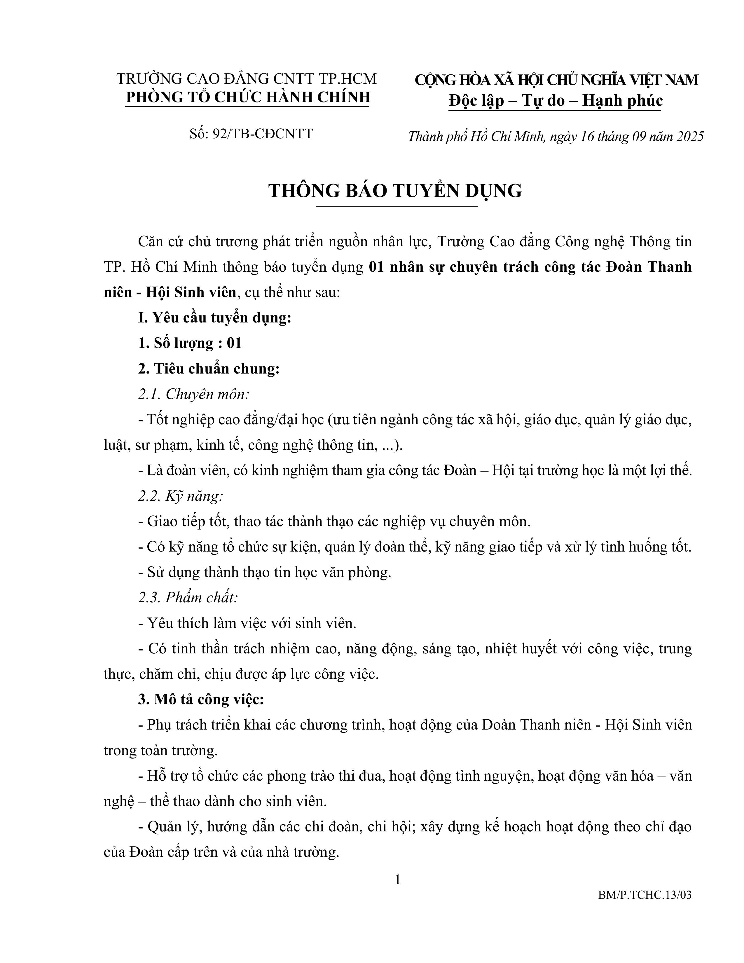 Trường ITC tuyển dụng nhân sự chuyên trách công tác Đoàn Thanh niên - Hội Sinh viên