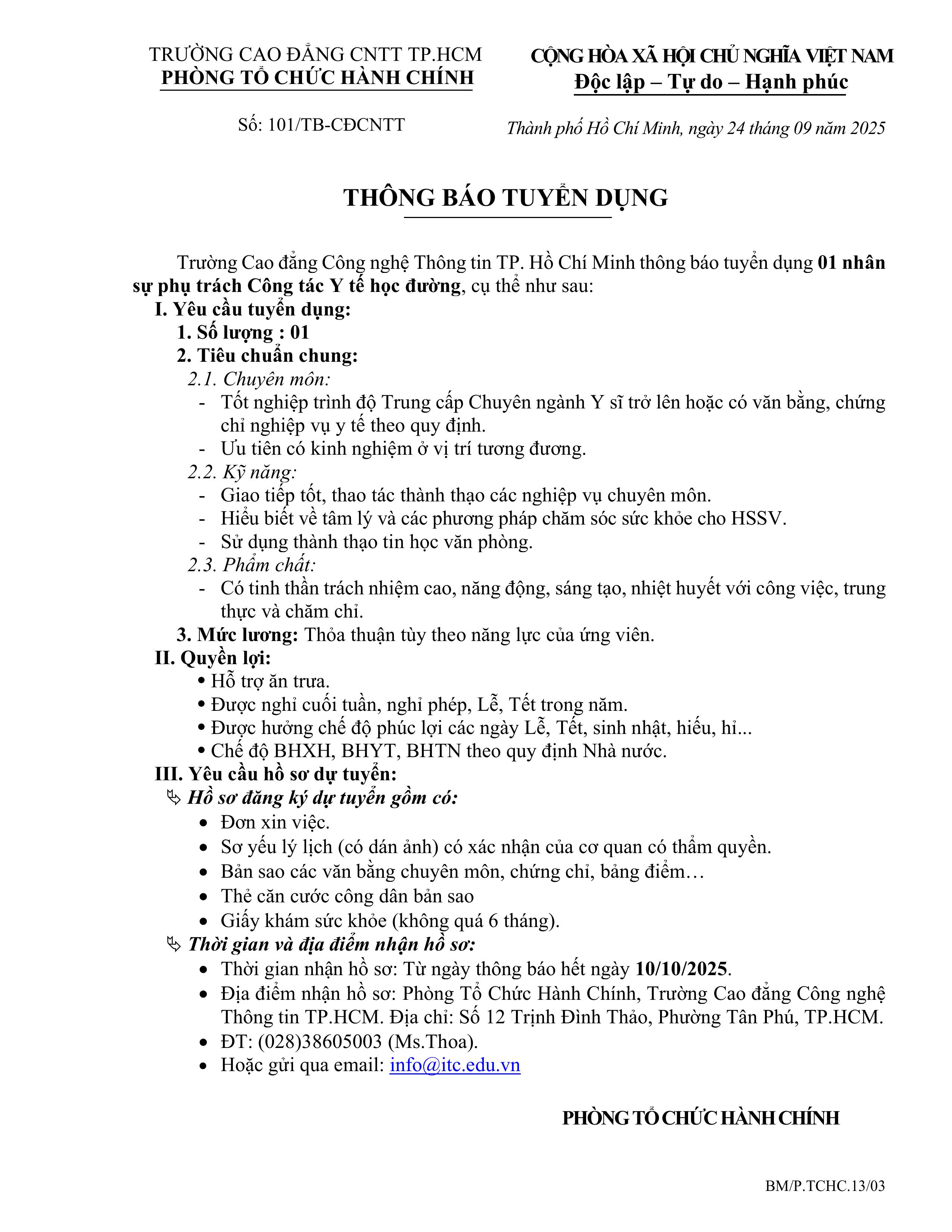 Trường ITC tuyển dụng nhân sự chuyên trách công tác Đoàn Thanh niên - Hội Sinh viên